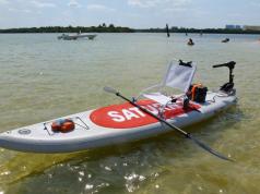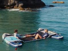 Here is a paddleboard that can accommodate 4 riders. It has a 8″-thick PVC construction and 17′ L x 5′ W surface. This paddleboard can support up to 1565lbs of weight. The top of it has a large EVA foam foot pad to provide you a slip-resistant surface.