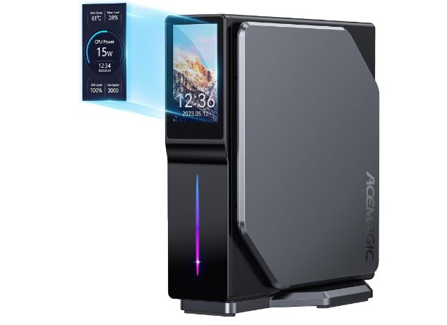 Here is a mini PC with a LCD screen that shows load, temperature, and other relevant system information as you use it. The ACEMAGIC S1 has an Intel Alder Lake-N95 processor with 16GB RAM and 512GB SSD. It has WiFi 5 and Bluetooth 4.2 connectivity. It has 2 x HDMI 2.0 ports.