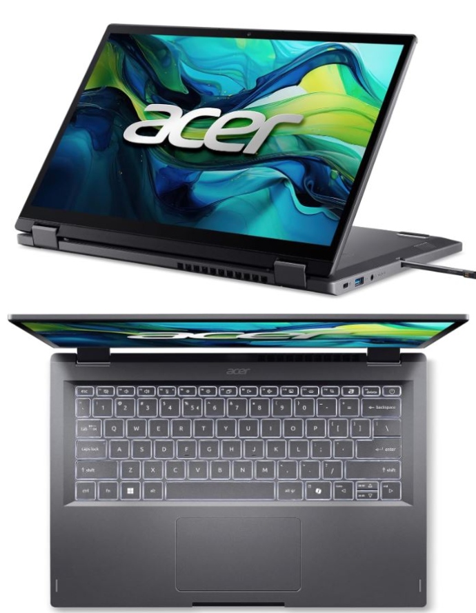Meet the Acer Aspire Spin 14: a lightweight laptop with a 360-degree hinge that lets you switch between laptop, display, tent, and tablet mode. It is powered by the Intel Core 7 processor 150U processor with 16GB RAM and 1TB M.2 SSD. It has a USB-C and HDMI 2.1 port for 4K resolution to external displays.