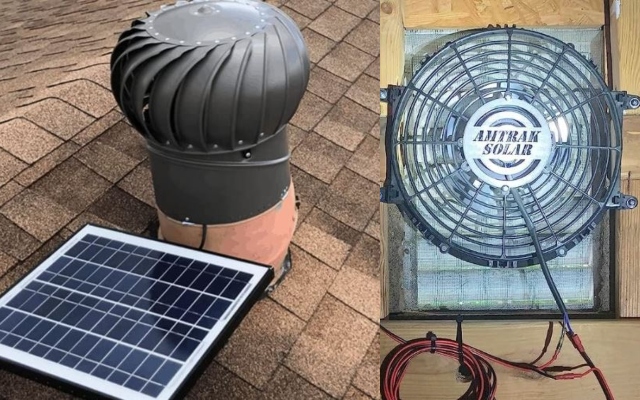 Here is a 50-watt solar roof exhaust fan that helps cool down and ventilate your home and garage. It also protects against moisture build-up. The Amtrak Solar Attic Exhaust Fan comes with a 12-inch plastic fan and a solar panel. It can easily replace standard powered attic ventilators.
