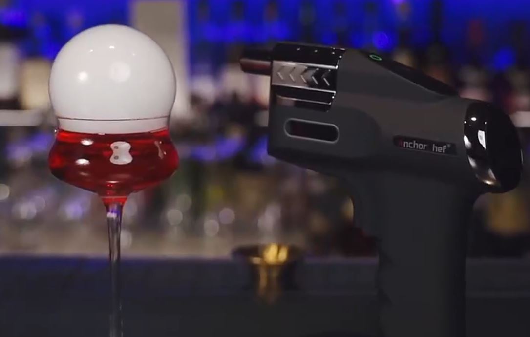 This is the AnchorChef Vapour Blaster Ultra: a nifty cocktail smoker bubble gun that you can use to experiment with various flavors. It lets you add bubbles and a cloud of smoke to your drinks. It comes with green apple, coffee, and other flavors. This can be used on steaks and desserts too. To use this, simply disassemble the muzzle camp, refill, put it back together, dip the gun into the bubble liquid, and activate the smoke mode.