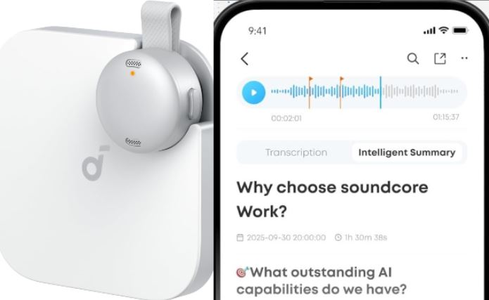 Voice recorders are getting a lot smarter. They now offer integration with GPT-5 and other LLMs to transcribe and translate your conversations. Take the Anker Soundcore Work: it is a lightweight, wearable voice recorder that uses GPT to transcribe your recordings. Its speech to text model supports over 100 languages. You can wear this around your neck or put it on your shirt. It also attaches to the charging case on your phone.