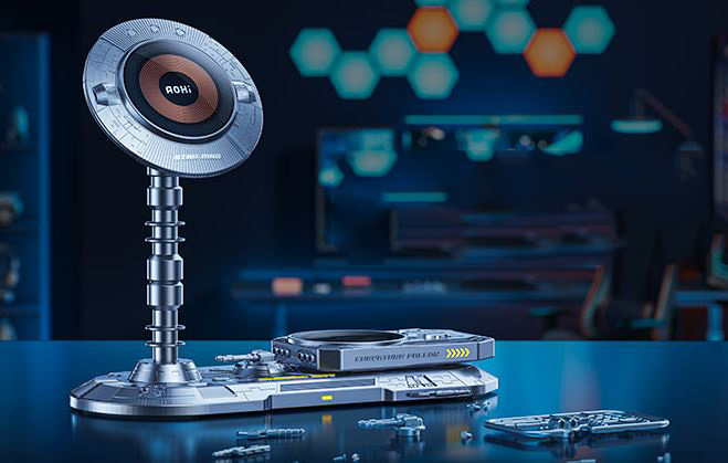 This is the AOHi Eternal City Charging Station: a space inspired DIY wireless charger that can charge your phone, AirPods, and other Qi & MagSafe compatible devices. It comes with a spaceship-inspired magnetic battery and a UFO-shaped wireless charger. It also has a Skylon-like stand.