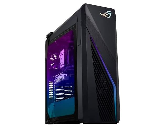 This is the ASUS ROG G16CH Gaming PC (G16CH-DB774): a powerful desktop PC powered by the Intel Core i7-13700F processor with 16 cores and GeForce RTX 4070 graphics. This Windows 11 computer has a minimalist chassis with a mesh front panel and a double D-ring handle. It also has a headset holder.