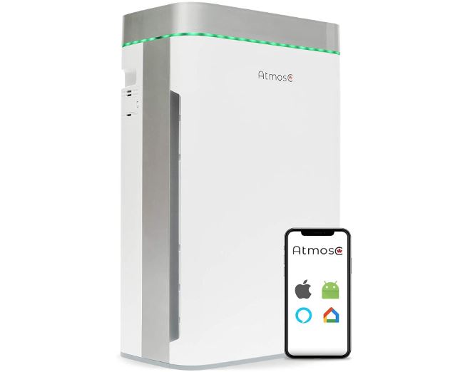 The AtmosC A Series air purifier has a noise rating of 24dB in sleep mode. It has a clean air delivery rate of 500CFM. It comes with iOS and Android apps. Users can keep up with PM2.5 level, humidity, fan speed, and filter life on their phone.