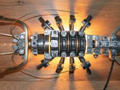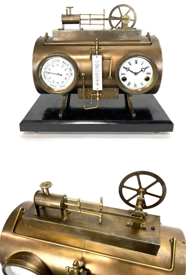 In the past few years, we have covered plenty of rare clocks here. This French 8-Day Brass Automaton Steam Engine Clock is quite special. It is an industrial automaton clock with a marble base. This clock has a spinning powertrain wheel, barometer, and thermometer.