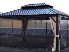 This gazebo comes with 10 customizable accessory hooks. It also has a removable PowerPort with 3 outlets and 3 USB ports for your gadgets. It measures 12ft x 6ft 4in x 7ft 9in. You can find out more here.