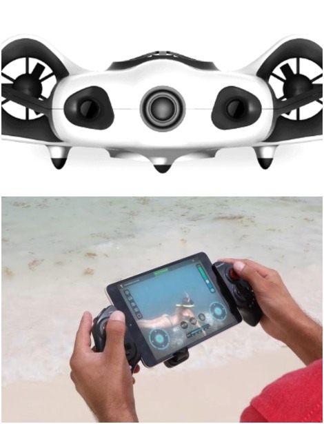 This smart underwater drone has a max speed of 2 m/s and lasts up to 7 hours on battery. It comes with 1380×2 Lumens LED lights and 3 tether lengths up to 150m.