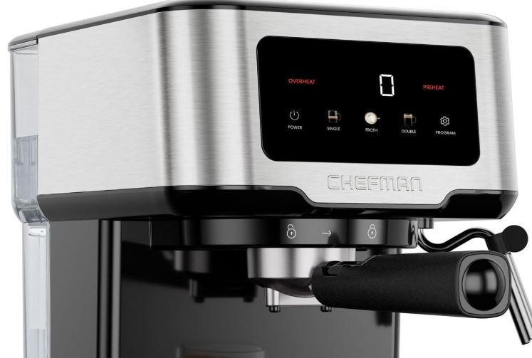 Here is another sleek espresso machine that you can use to make latte, cappuccino, and other delicious drinks. This 15-bar digital espresso maker has a 1.5L removable water reservoir. It has two shot baskets and a built-in steam wand for single and double shots. This unit has a touchscreen control panel for choosing programs. It also has a convenient timer.