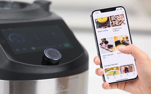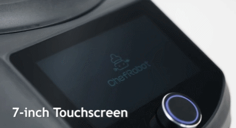 This is the ChefRobot CR-8: a WiFi connected kitchen assistant that replaces multiple appliances. It has a 7-inch touchscreen display and a rotary knob for easy control. It also has multiple blades for various kitchen tasks. It has a built-in scale to weigh your ingredients.