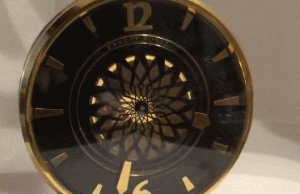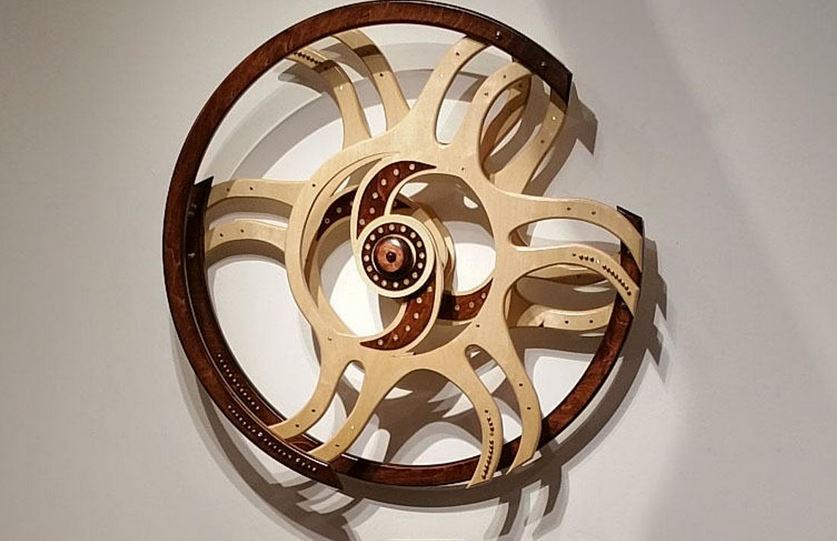 Here is a kinetic wood sculpture that puts on a trippy show as you let it run. The Circle of Inspiration Sculpture can run up to an hour after you wind it. It incorporates moire patterns. It also makes relaxing sounds as the wheels turn.