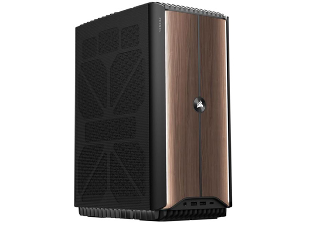 This is the Corsair ONE i500 Gaming PC: a powerful computer with the Intel i9 14900k processor, NVIDIA GeForce RTX 4080 Super graphics card, and 32GB RAM. It is liquid cooled to perform under load. This model has a recycled aluminum case with a wood accent panel. You can get it on bright and dark wood colors.