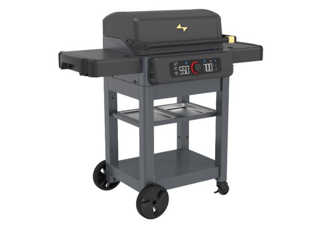 This is the Current Model G Dual-Zone Electric Grill: a fast heating electric grill that is ready to cook in about 10 minutes. It has a max temperature of 700F. It comes with WiFi connectivity. The Current Backyard app lets you monitor and control the temperature.