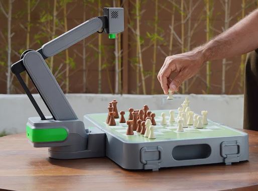 This chess robot has a display that it uses to express itself. It uses Stockfish with 8 levels to give you a game. Unlike other chess robots, you can just pack this up and take it with you anywhere. The arm and pieces fit into the board, which acts as a carry case with a handle when you fold it. Cynus has free and match modes. You can write you own code and link it to platforms like Lichess and Chess.com. This robot lasts over 10 hours on battery.