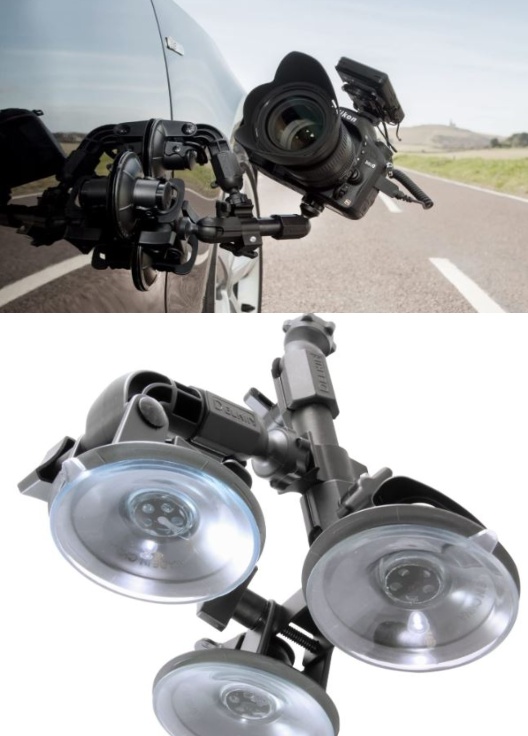 Here is a heavy duty camera mount with triple suction cups that helps you get more creative with your camera. The Delkin Fat Gecko Triple Suction Camera Mount lets you attach your DSLR and other cameras to your vehicles and other similar surfaces. It has 6 adjustable points and supports devices up to 12lbs.