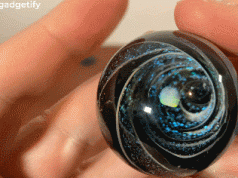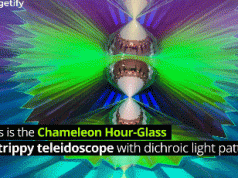 Marc Tickle is behind some of the coolest teleidoscopes we have tested. The Disco Dandelion is pretty special though. It is a large teleidoscope with 4 tapered reflective surfaces, including a dichroic mirror, to create psychedelic imagery. It measures 13-1/4″ long by 2″ in diameter. It has crystal spheres inside that move as you tilt the scope up and done.