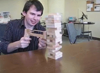 The game of Jenga is a pretty neat strategic game. It is even more fun to play with this Jenga Pistol. Instead of sliding blocks out, you can now just shoot the blocks out with this pistol. It works “by hurling a wooden captive bolt forward inside the pistol, powered by rubber bands. The bolt has a pin on the front, which protrudes out of the muzzle of the gun by about 2 cm at most. This is enough to transfer the momentum of the bolt to the Jenga block in front of the gun.”