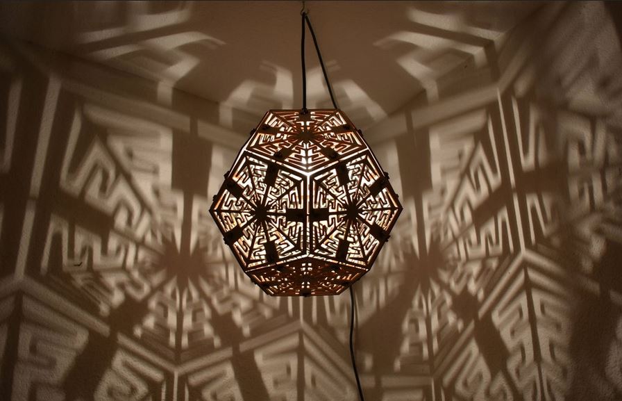 Here is another gorgeous geometric lamp that casts beautiful shadows on your walls. This dodecahedron ceiling lamp has a laser cut Baltic Birch wood construction. It measures 12″ in diameter and can be assembled in 10 minutes. The lamp comes with a 5m cord and uses a clear incandescent bulb.
