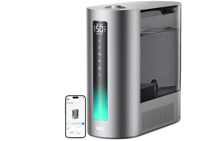 This humidifier uses MistWave technology to create a 43-inch tall mist. It has 3 modes for you to choose from. You can see real-time humidity readings through the Dreo app. The device has a min noise rating of 28dB. It has a dual-aroma pad tray, so you can switch between scents conveniently.