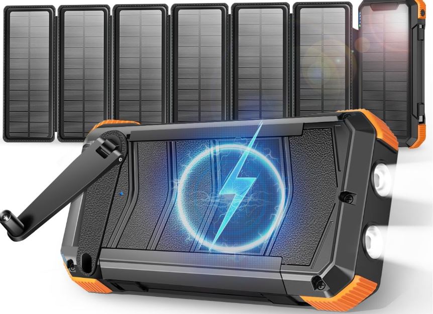 This power bank has 20,000mah battery capacity and can charge up to 3 devices at the same time. Its solar panels offer 1500mAh/h charging performance. The panel is detachable and can be used directly with your phone. The hand crank charger can generate 650mAh of juice each hour. The ecoCalm Wireless Charging Power Bank has a waterproof and shockproof design. It has a fire starter and flashlight.