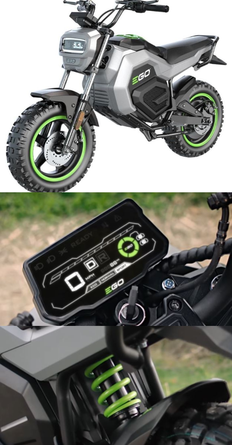 This mini bike uses EGO POWER+ 56V ARC Lithium batteries. Its digital display makes it easy to monitor your speed, acceleration, and other info. This bike also has a compartment for carrying an extra battery. It is IPX4 rated. It is rated for users up to 220lbs.