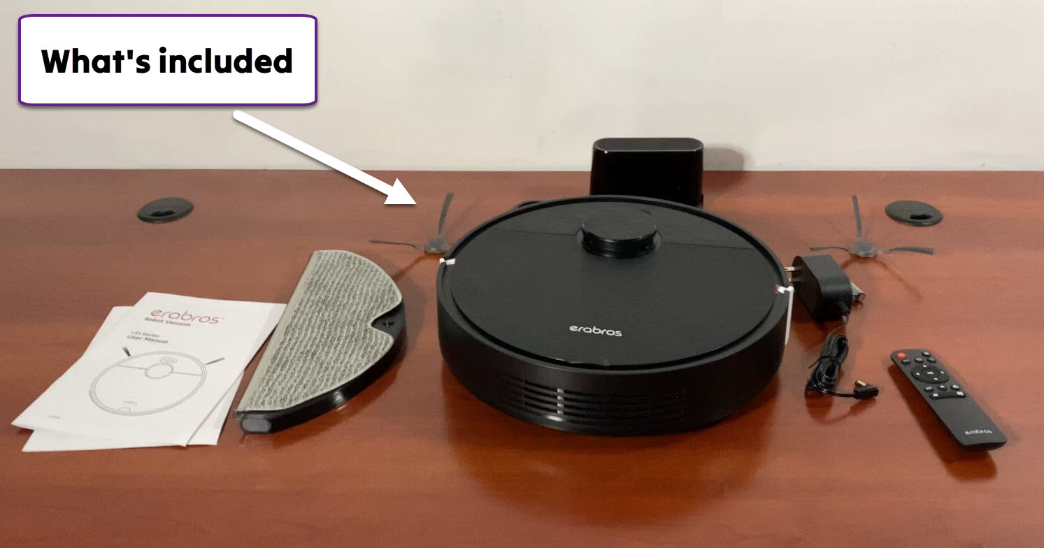 We recently had a chance to get our hands on one of these robots. It shipped with a simple base, mop pad / water tank, the main robot and brushes that you can install easily. The remote is very similar to RS1’s but it lets you change mop settings. We didn’t even need to look at the manual to attach the brushes and mop.