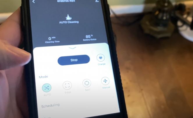 The erabros RS1 has spot, edge, auto, and manual cleaning modes. It has a handheld remote that lets you control where the robot goes. You can set the robot on a schedule on your phone or remote control it with your smartphone. It works with the Tuya app for iPhone.