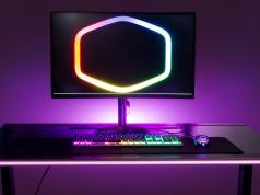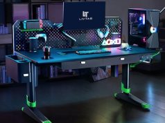 Meet the Eureka Z1-S Gaming Desk: a gaming desk with blue ambient lighting and everything you need to play games like a pro. It comes with adjustable leveling feet. The Eureka Z1-S Gaming Desk has a large gaming surface but also comes with convenient features such as a cup holder.