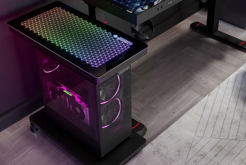 Storing your PC on the floor is not always the best idea. For starters, it won’t be as easy to move around. It could also slow down heat dissipation. The EUREKA Height Adjustable Computer Stand can help. It can accommodate most full tower ATX cases on the market. It has RGB lights that you can control from your phone. You get 38 lighting modes and 6 sync modes.