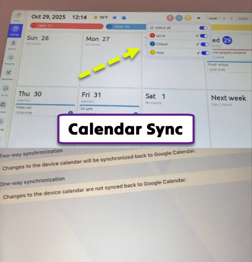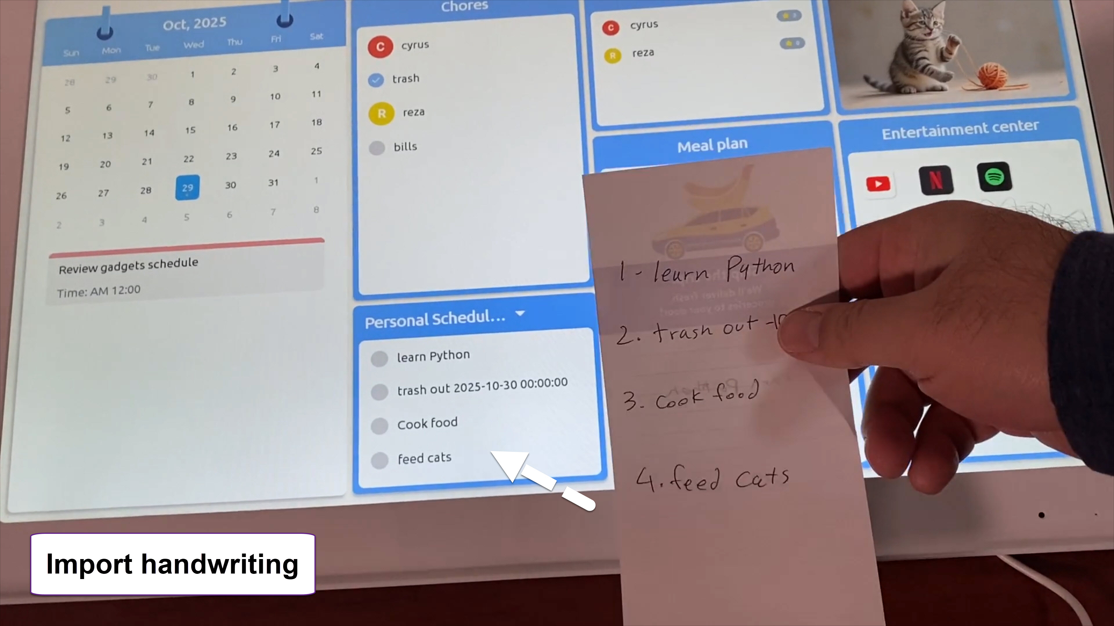 This is like a giant tablet, so you can add entries with a simple touch. It is also possible to import them from the app. We were able to import our tasks and events from iCloud and Google, but Cozi, Yahoo, and Outlook are also supported. You can add members in different colors, which makes it easy for everyone in your household to see their tasks. For calendars like Google, 2-way sync is possible.