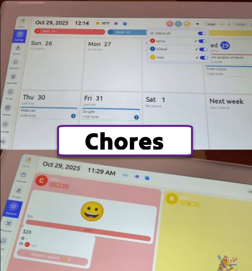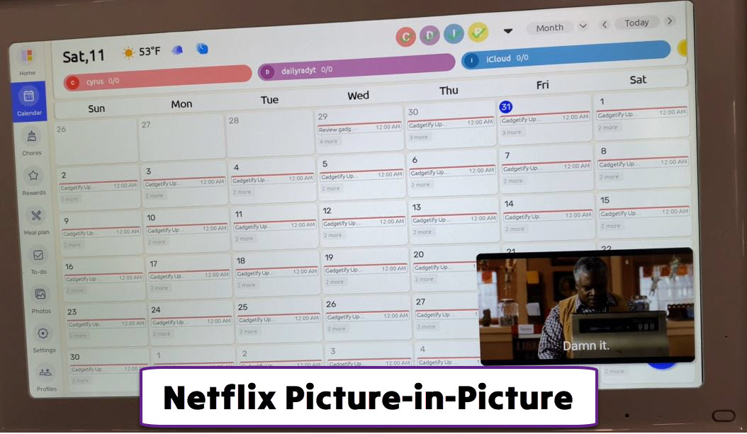 The display is quite bright and has plenty of space to keep up with your chores, events, and rewards. The main interface is pretty easy to get used to. You get separate views for your calendars, chores, rewards, to-dos, and photos. You can quickly press the front button to see the Home view, which brings everything together, including your chores, personal to-dos, images, and entertainment apps. If you are using apps like Netflix, you will be able to view your movies in a tiny window while going through your schedule (picture-in-picture function).