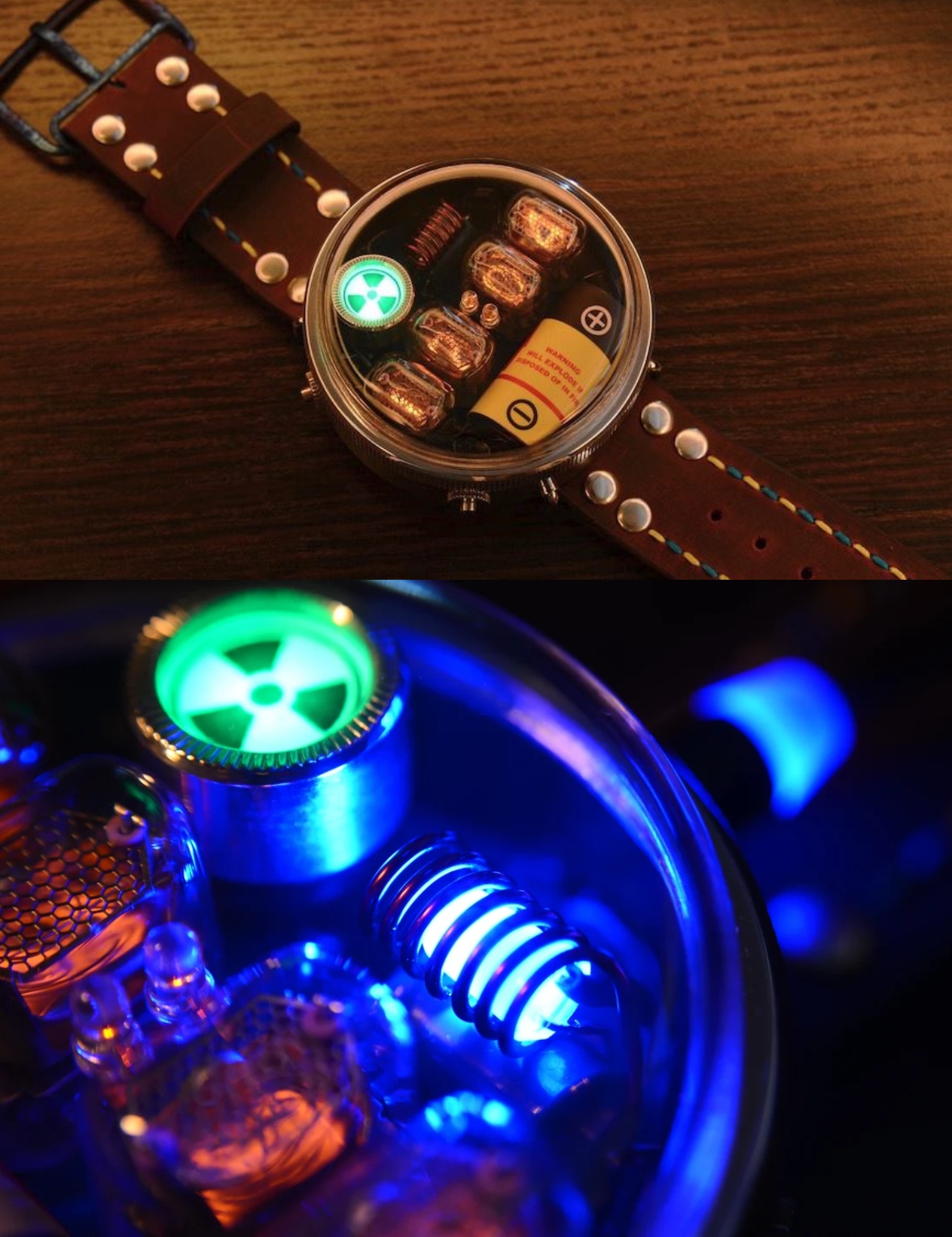 This Fallout Inspired Atomic Nixie Watch has a radiation icon with a backlight that activates when you turn the watch on. The battery lasts up to 12 hours. You can put it in sleep mode for 8 months.