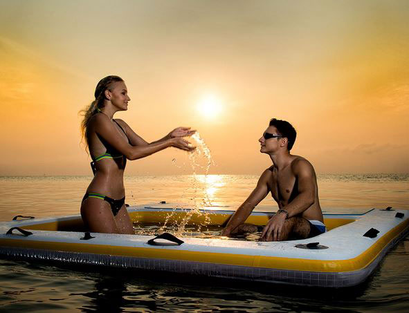 This inflatable lounge raft deck has a non-slip EVA standing surface and max weight capacity of 800 lbs. It measures 7.6 x 7.6 x 6ft.