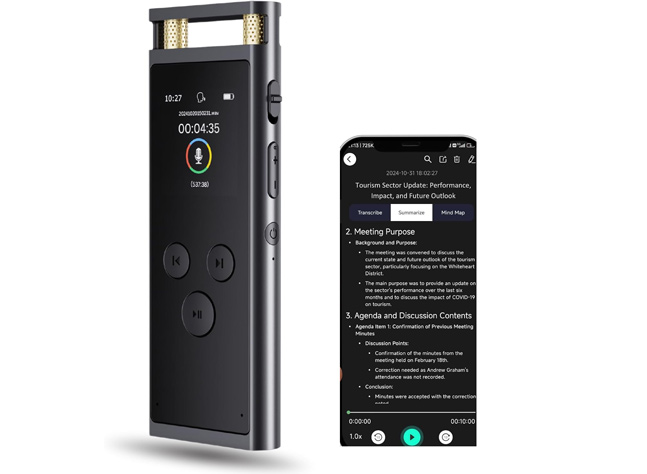 AI is making us productive in many ways. It can help you write, brainstorm, and even summarize long, boring meetings. The FoCase Rec is a handy digital voice recorder with AI transcription and summarization powered by GPT 4o. This particular model has 64GB of storage space, which is more than enough for 500H of files. This gadget lasts up to 30 hours on battery. It is a color screen and a sleek aluminum alloy case.