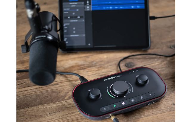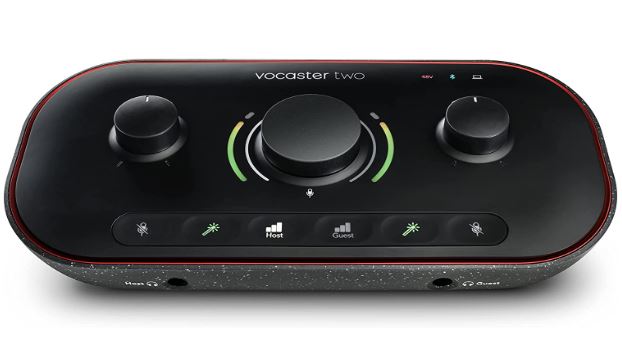 Here is another handy audio interface for podcasters. The Focusrite Vocaster Two has 2 mic inputs and 2 headphone outputs. It has 70dB of gain, so you can use it with most mics without any gain booster. 4 presets are available for your to choose from.