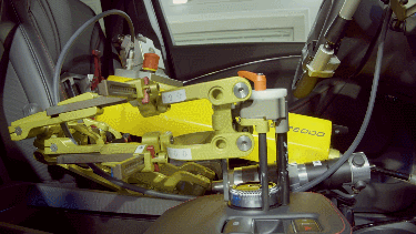 The robot test driver’s legs extend to the accelerator, brake and clutch pedals, with one arm positioned to change gear and the other used to start and stop the engine.