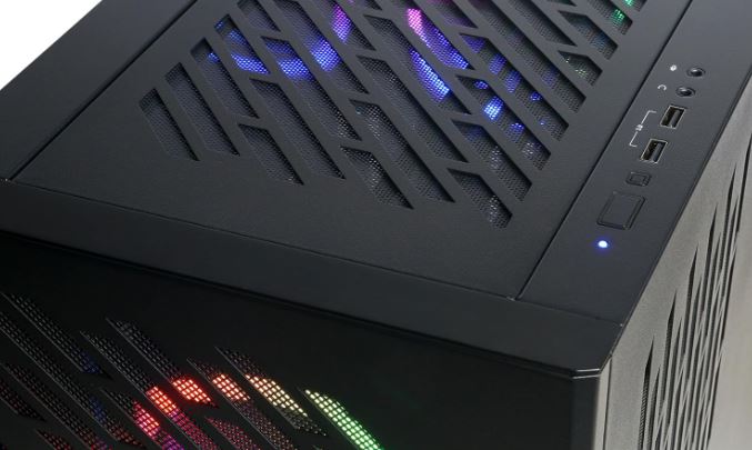 This computer has a tempered side case panel with RGB lighting. It has 4 x USB 3.1 and 4 x USB 2.0 ports. You can connect 3 displays through its DP and HDMI ports. It runs Windows 11.
