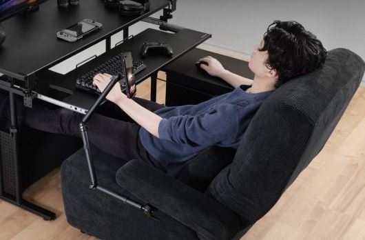 This is the Bauhutte Gaming Sofa Deluxe: a recliner designed with gamers in mind. It has 6 lower back and 7 level upper back angle adjustments. It also features 45-level armrest adjustment. It has a clamp mounting bar that you can use to hold your smartphone and other devices.