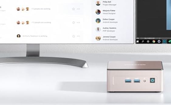 This Windows 11 computer has 8K output and support for up to 4 screens through its HDMI and USB 3.2 Gen 2 Type-C ports. This mini computer also has WiFi 6 and Bluetooth 5.2 connectivity. It has enough power to handle Photoshop, Adobe Premiere Word, and other popular apps. It has a copper base and an aluminum heatsink plus a smart fan for cooling.