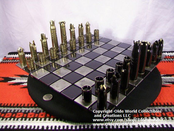 50 Caliber bullet shell chess pieces: has 1/8 inch flat steel squares welded to 1/2 inch square bars. The pieces are made from .50 caliber bullet shell casings.