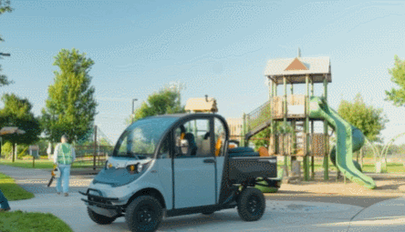 This is the GEM eX: an electric utility terrain vehicle that can be used to transport things at campuses, industrial sites, and other similar facilities. It can high towing capacity for serious work. The GEM eX has a top speed of 25mph with 1250lbs load capacity. It has a rear-wheel drive electric motor system with limited-slip differential for better traction when needed. It can climb curbs and other common obstacles.