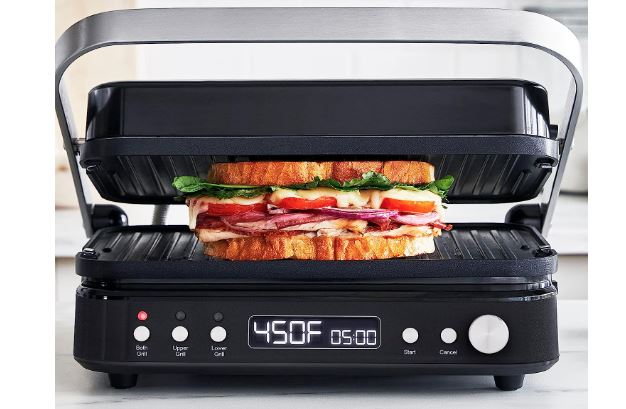 This grill lays flat to give you more room to cook your food. It has reversible grill and griddle plates that are dishwasher safe. You can even make waffles with this. Its cover height can be adjusted. The drip tray is removable for easy cleaning.