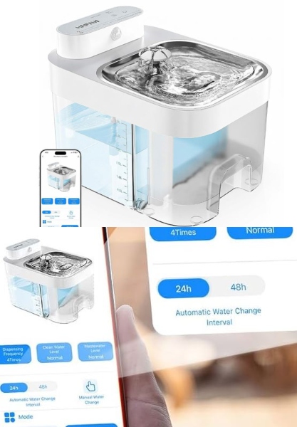 The HAPAW Cat Water Fountain operates at 20dB. It comes with app connectivity that lets you see wastewater and clean water levels. You will also be able to change automatic water change interval from 24 to 48H. In sensor-activated mode, this water dispenser lasts up to 15 days.