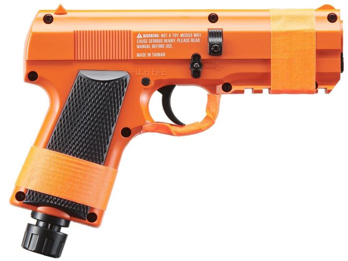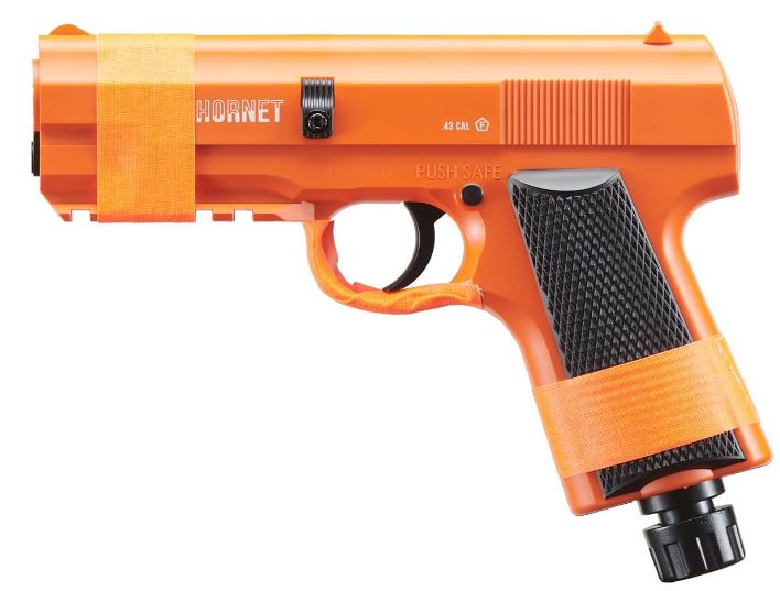 Meet the Hornet Air Pistol: a self defense tool that shoots .43 caliber pepper rounds and rubber balls. It has max velocity of 380fps, allowing you to defend yourself from 30 meters. It uses a 8g CO2 cartridge. It has a polymer body and semi-automatic firing mode. Its magazine has 4 rounds capacity.