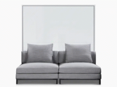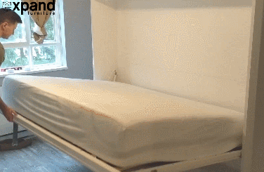 Meet the Hover Compact Horizontal Double / Full Wall Bed from Expand Furniture: a spacing saving bed for wide and narrow spaces or low ceilings. It has a slatted wood bed base and metal bed frame. It is stored on your wall without taking a lot of space when you are done sleeping but turns into a comfortable bed in a flash.