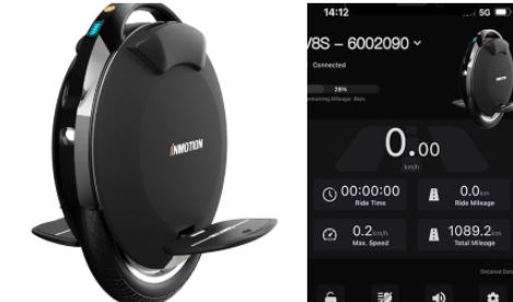 This is the INMOTION V8S: an electric unicycle with a 16-inch wheel that gives you a smooth ride outside. It has max speed of 22mph and can handle up to 30-degree climbs. It has a range of 47 miles. It is powered by a 1000W motor and can be controlled with your phone. You will be able to use your phone to monitor riding status and stats. You can also perform firmware upgrades.