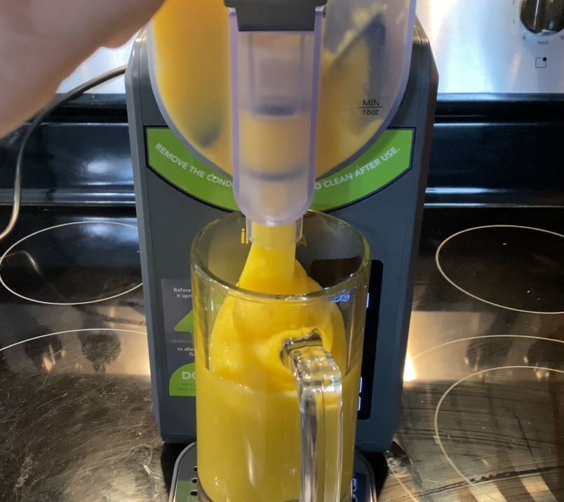 The machine weighed 21.6 lbs according to our scale. It is not heavy but a bit large, so you will want to handle it with care. The handle drops into the front slot, allowing you to dispense your drink with a simple pull. In order to make slushies, you are going to need a drink that has more than 5% sugar. If you are planning to use alcoholic beverages, they must be under 16% alcohol content. We made a bunch of drinks in this, including an orange slushie and a ChatGPT-recommended frappe.