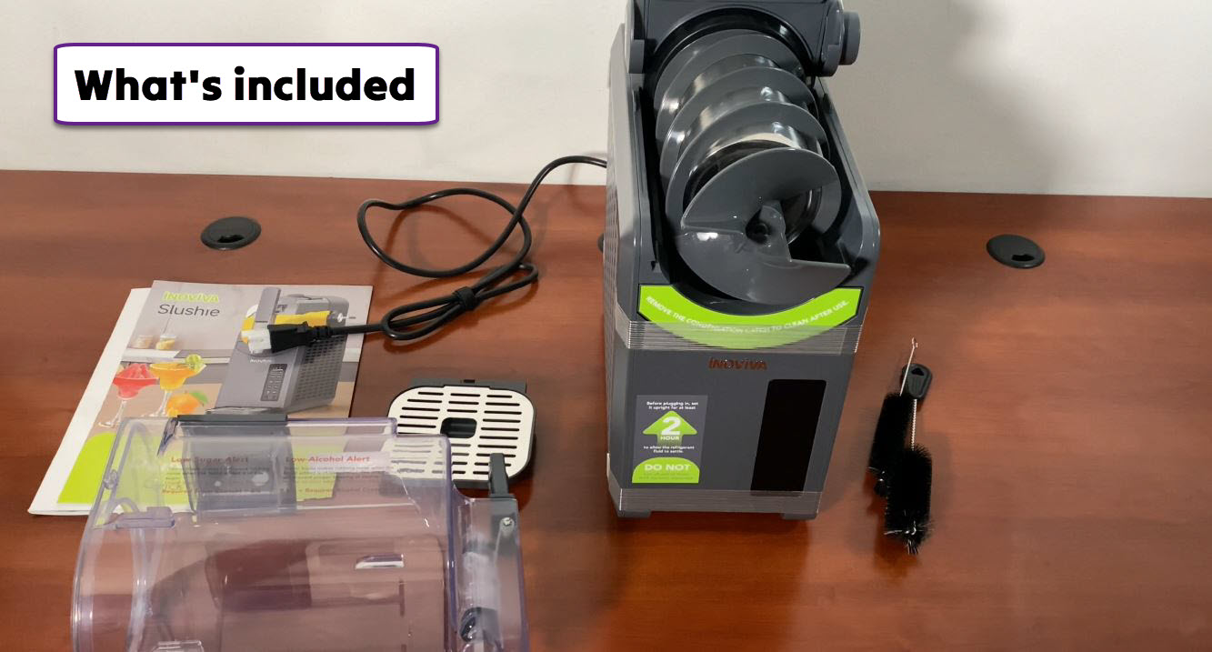 It was only a couple of months ago that we had the chance to test the first-generation Inoviva Slushie Maker: it is a no-ice slushie machine with wine, slushie, frappe, cocktail, and milkshake programs. The Inoviva S2.0 Slushie Machine picks up where the previous generation left off. It has 88 oz capacity, so you can make frozen treats for up to 9 people. We were recently sent one of these to test. Let’s see what was included: