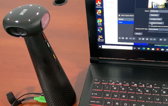 Our TOTEM 360 came with a USB-C cable, main camera, a power adapter, and international plug adapters. It has 4 cameras and beamforming microphones to capture the entire room. It has AI to identify speakers and highlight them. It can also track their movement. We tested the camera with Skype and OBS Studio and had no trouble setting it up. It is also compatible with Google Meet, Microsoft Teams, and other popular online collaboration apps. For OBS Studio, you simply have to add a video and audio source and use Totem as your camera, speaker, and microphone.