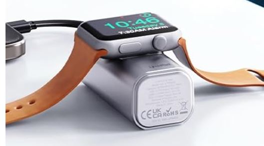 This power bank can charge your Apple Watch wirelessly. It is compact enough for you to easily take with your keys. The LED indicator light lets you know how much battery you have left. This charge has over-temperature, over-current, over-voltage, and short-circuit protection.